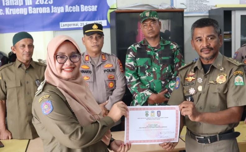 Penyerahan penghargaan tersebut turut disaksikan oleh unsur Muspika Kecamatan Krueng Barona Jaya, perangkat gampong, serta petugas Satpol PP dan WH Aceh Besar, dan tim media.