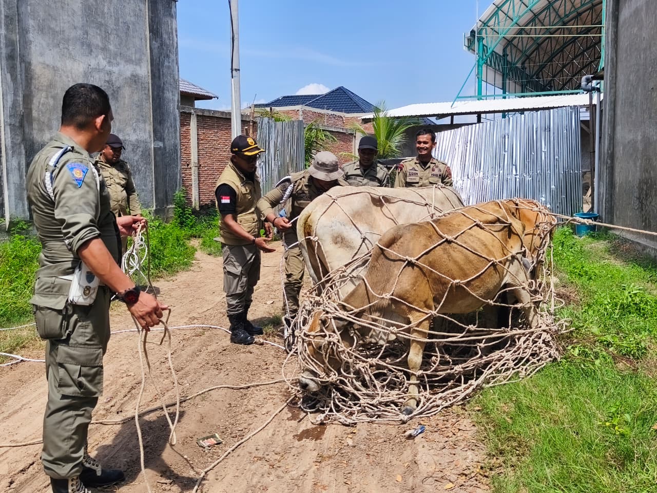 MediaNanggroe.com — Menindaklanjuti laporan masyarakat, Satuan Polisi Pamong Praja dan Wilayatul Hisbah (Satpol PP dan WH) Kabupaten Aceh Besar melakukan penertiban dan berhasil mengamankan lima ekor ternak sapi yang berkeliaran di ruas Jalan Rel Kereta Api Lama, kawasan Pagar Air, Kecamatan Ingin Jaya, Kabupaten Aceh Besar, Jumat (24/4/2026).