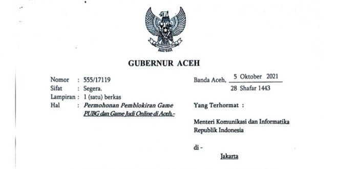 MediaNanggroe.com, BANDA ACEH – Gubernur Aceh, Ir. Nova Iriansyah MT., meminta Menteri Komunikasi dan Informatika Republik Indonesia, untuk memblokir situs game Playerunknown’s Battleground (PUBG) dan sejenisnya, mengingat semakin maraknya penggunaan game PUBG dan Game judi online di kalangan masyarakat Aceh.