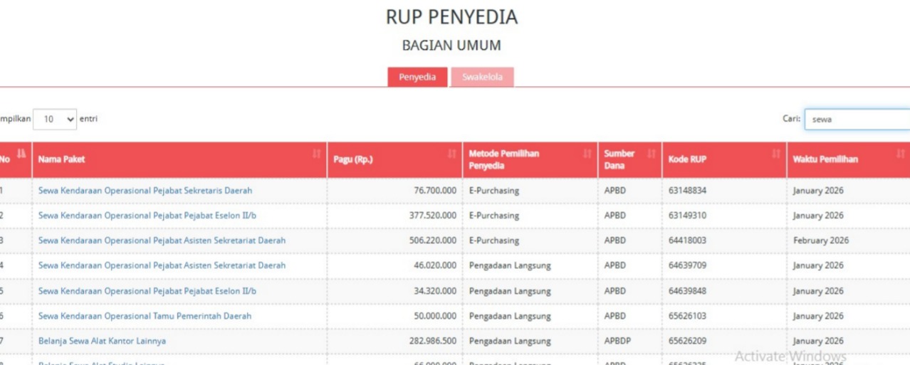 Sementara itu, melalui metode pengadaan langsung, terdapat tambahan paket sewa kendaraan operasional dengan nilai yang lebih kecil. Sewa kendaraan untuk Pejabat Asisten Sekretariat Daerah dianggarkan Rp46.020.000, Pejabat Eselon II/b sebesar Rp34.320.000, serta sewa kendaraan operasional untuk tamu pemerintah daerah sebesar Rp50.000.000.