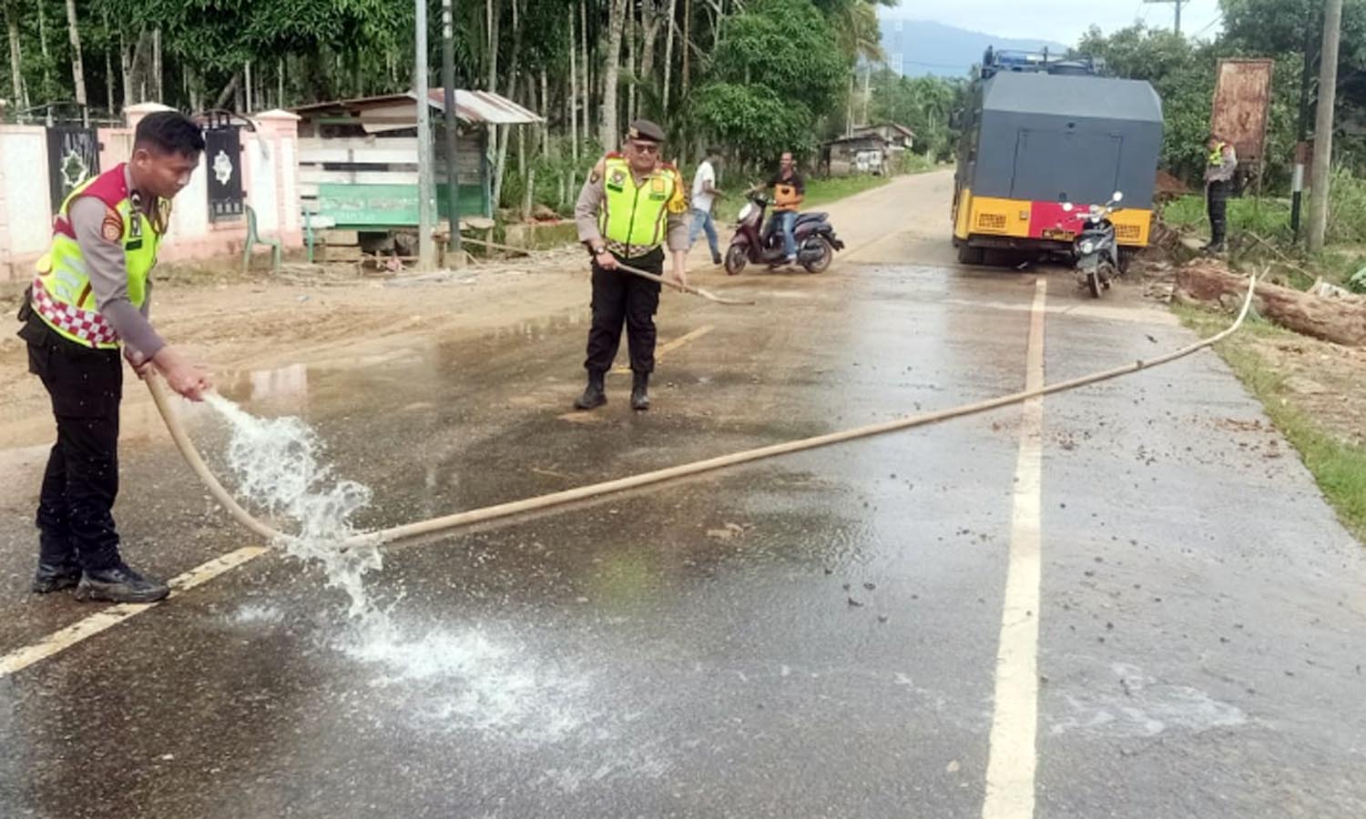 Kegiatan ini dilakukan sebagai respons atas kondisi jalan yang dipenuhi sisa lumpur dan debu akibat bencana banjir bandang yang melanda wilayah Trumon Tengah. Dengan menggunakan kendaraan Armoured Water Canon (AWC), anggota Sat Samapta Polres Aceh Selatan melakukan upaya penyemprotan untuk membersihkan jalan nasional yang menjadi jalur vital masyarakat.