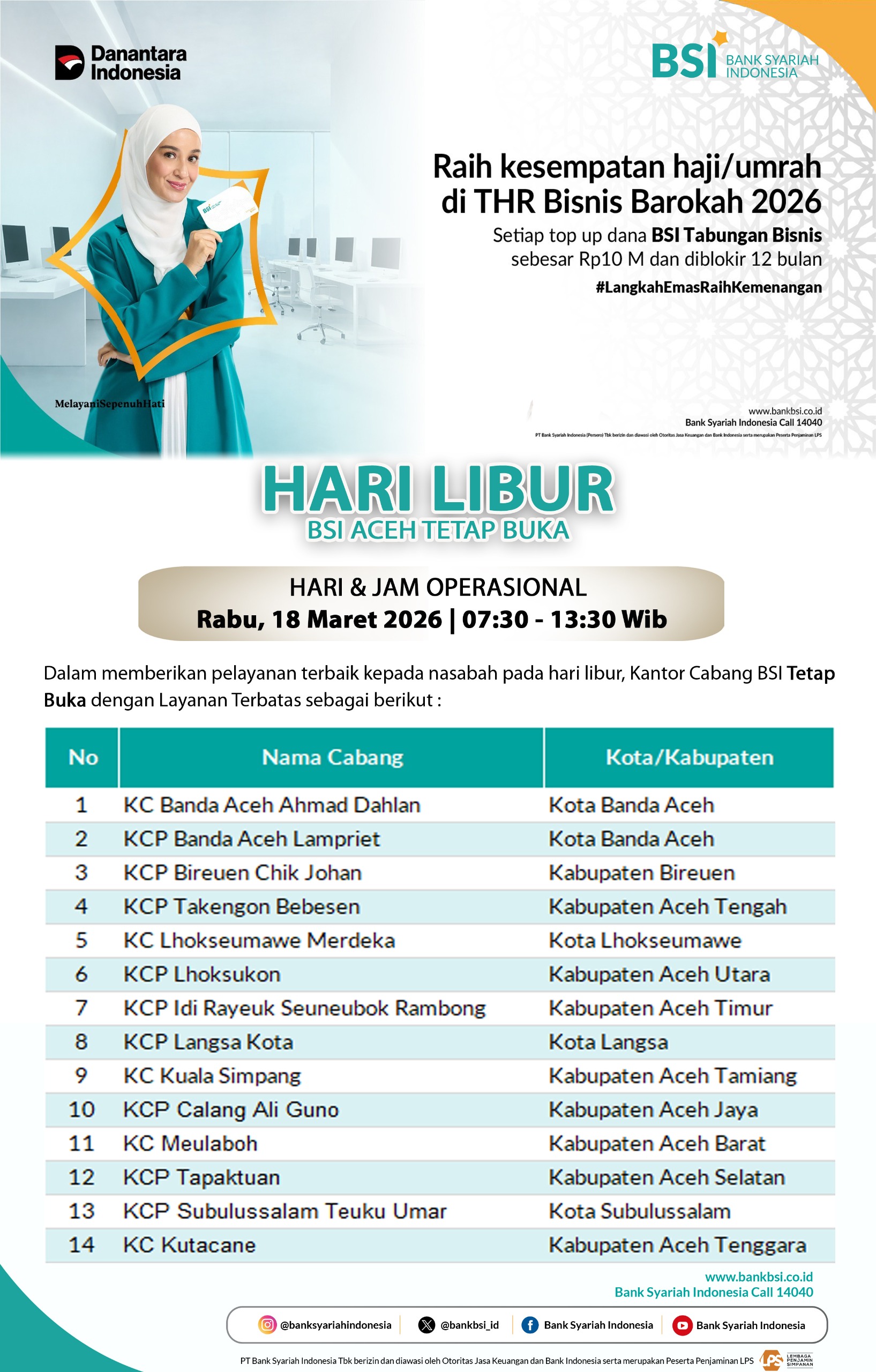 MediaNanggroe.com — Bank Syariah Indonesia (BSI) Regional Aceh memastikan tetap memberikan layanan operasional terbatas selama libur panjang Idul Fitri 1447 Hijriah. Sebanyak 22 outlet BSI di wilayah Aceh akan tetap beroperasi pada 18, 19, 23, dan 24 Maret 2026 guna melayani kebutuhan transaksi nasabah.
