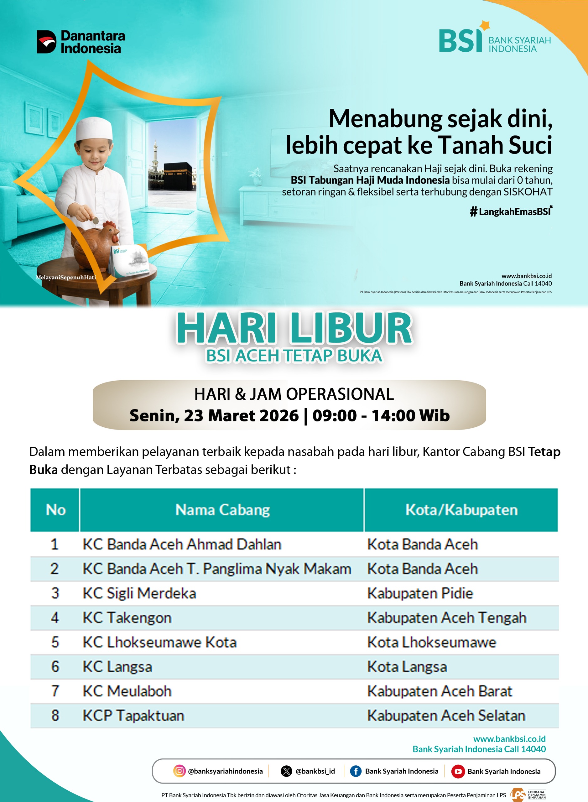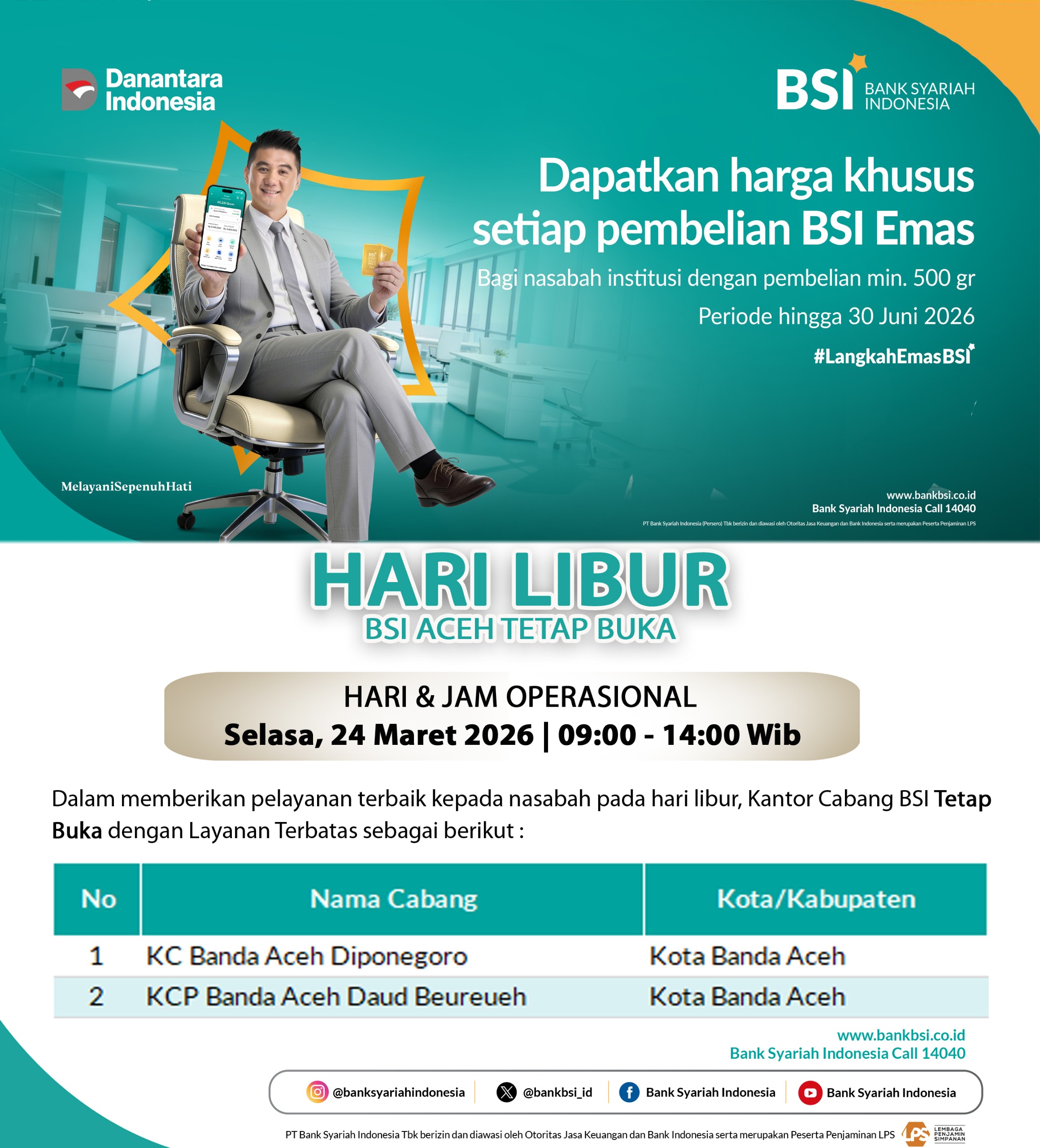 BSI Aceh Tetap Beroperasi pada Libur Panjang Idul Fitri 1447 H, 22 Outlet Siap Layani Nasabah