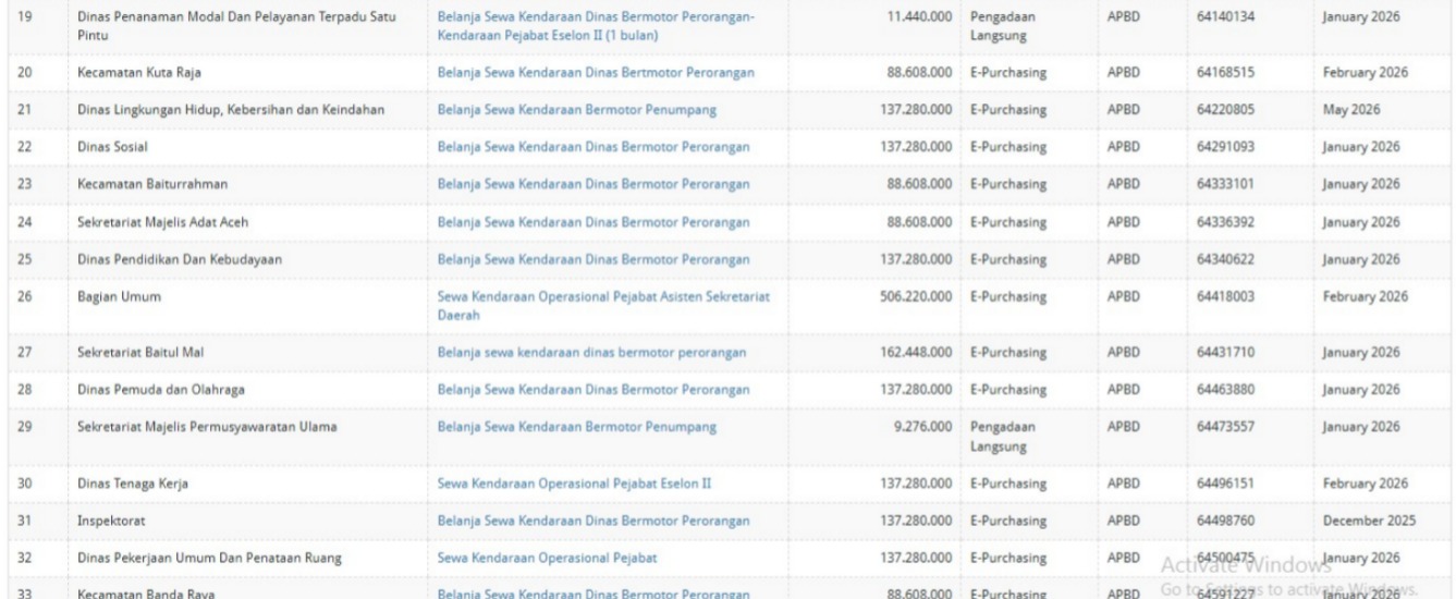 MediaNanggroe.com – Belanja sewa kendaraan dinas di lingkungan pemerintah kota tercatat mencapai angka miliaran rupiah berdasarkan data Rencana Umum Pengadaan (RUP) per 23 April 2026. Anggaran ini tersebar di puluhan organisasi perangkat daerah (OPD), dengan pola pengadaan didominasi melalui skema e-purchasing sejak awal tahun anggaran.