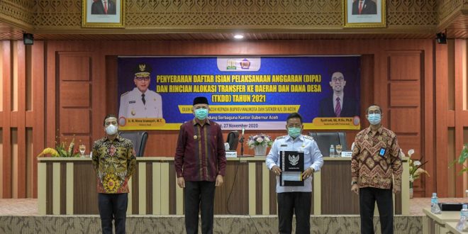 Banda Aceh MediaNanggroe.com – Gubernur Aceh Nova Iriansyah menyerahkan Daftar Isian Pelaksanaan Anggaran (DIPA) Kementerian/Lembaga dan Daftar Alokasi Transfer Ke Daerah dan Dana Desa (TKDD) Tahun Anggaran 2021 sebesar Rp.48,9 Triliun, Jumat 27/11. Anggaran tersebut terdiri dari Belanja Kementerian/Lembaga sebesar Rp.14,46 triliun dan Dana Transfer Ke Daerah dan Dana Desa Sebesar Rp.34,4 triliun.