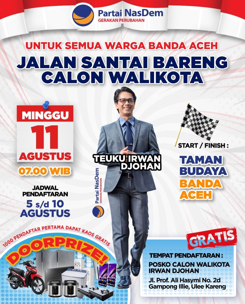 Banda Aceh  – Dalam rangka menyambut dan memeriahkan Hari Ulang Tahun Republik Indonesia ke-79, Calon Walikota Banda Aceh, Teuku Irwan Djohan, mengadakan kegiatan “Jalan Santai Bareng Calon Walikota”.
