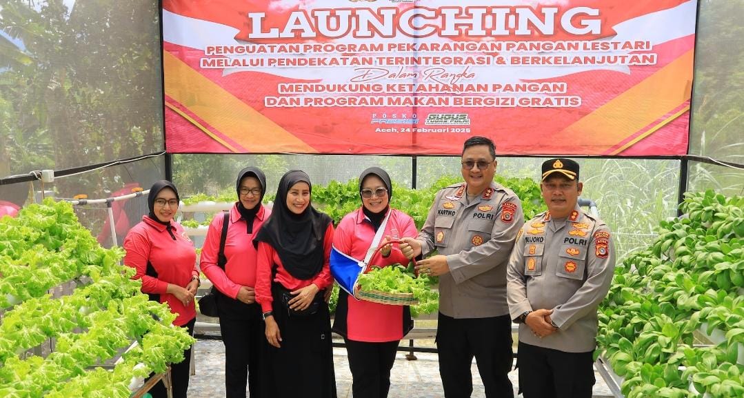 MediaNanggroe.com, Jantho – Kapolda Aceh Irjen Dr. Achmad Kartiko, didampingi Ketua Bhayangkari Daerah Aceh, Ny. Rani Achmad Kartiko, menghadiri secara virtual launching penguatan program Pekarangan Pangan Lestari (P2L) serentak di Polres Aceh Besar, Senin, 24 Februari 2025.