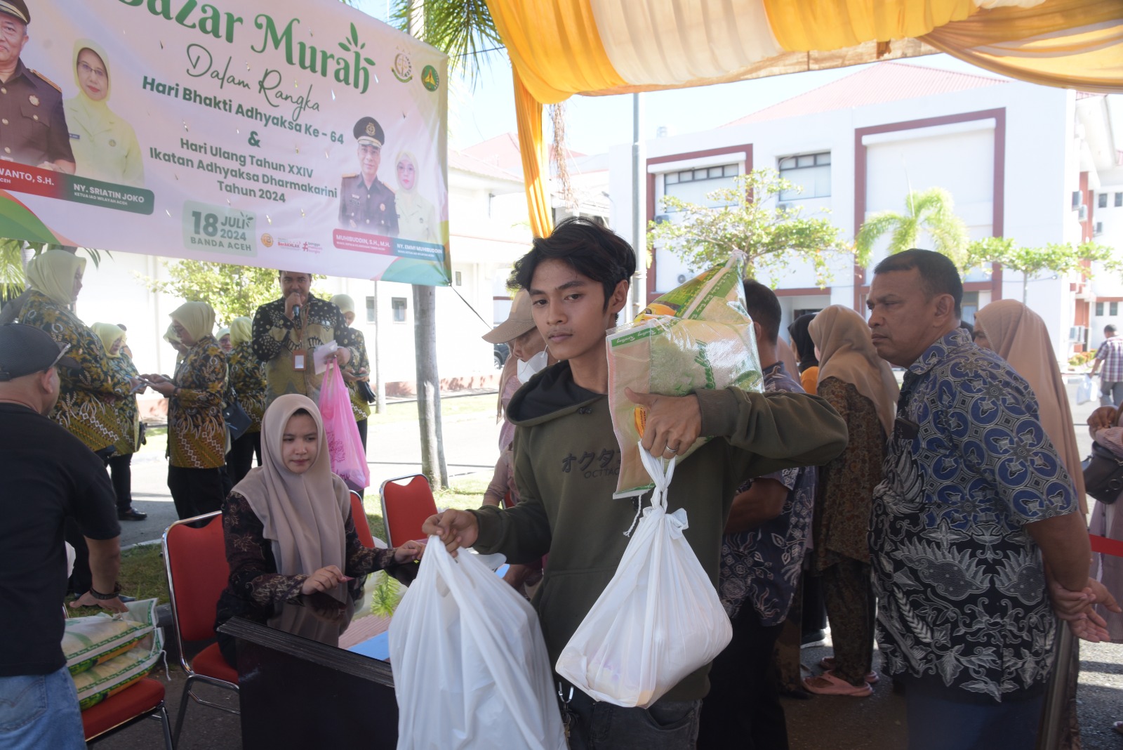 MediaNanggroe.com, Banda Aceh – Dalam rangka memperingati Hari Bhakti Adhyaksa ke-64 dan Hari Ulang Tahun Ikatan Adhyaksa Dharma Karini ke-24 tahun 2024, Kejaksaan Tinggi (Kejati) Aceh mengadakan kegiatan bakti sosial berupa pasar murah bagi masyarakat Aceh. Acara ini berlangsung di halaman Kantor Kejati Aceh pada Kamis, 18 Juli 2024, dan dibuka secara resmi oleh Kajati Aceh, Drs. Joko Purwanto, S.H. Didampingi ketua IAD wilayah Aceh dan pengurus IAD wilayah Aceh, Wakajati Aceh dan para asisten pada Kejati aceh