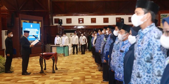 Sekretaris Daerah Aceh, dr. Taqwallah, M.Kes, saat melantik pejabat fungsional yang diangkat melalui mekanisme penyetaraan pada lingkungan Pemerintah Aceh, di Anjong Mon Mata, Banda Aceh, Jumat (31/12/2021).