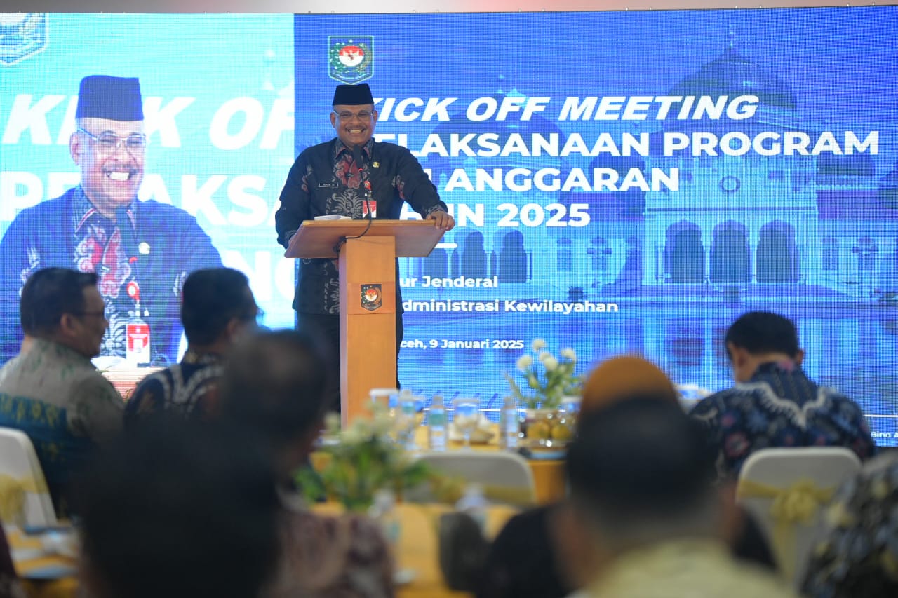 MediaNanggroe.com, Banda Aceh – Penjabat Gubernur Aceh, Dr. H. Safrizal ZA, M.Si., yang juga Direktur Jenderal Bina Administrasi Kewilayahan Kementerian Dalam Negeri, secara resmi membuka Rapat Kick-Off Meeting Pelaksanaan Program dan Anggaran Tahun 2025 Lingkup Direktorat Jenderal Bina Administrasi Kewilayahan. Acara ini berlangsung di Hotel Oasis Atjeh, Banda Aceh, pada Kamis (9/1) dan dijadwalkan berlangsung hingga 10 Januari 2025.