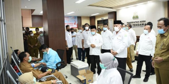 Sekda Aceh, dr. Taqwallah, M.Kes, bersama Ketua PMI Pusat, Dr. H. Muhammad Jusuf Kalla, saat meninjau pelaksanaan donor darah rutin ASN Pemerintah Aceh Ke-IV di Kantor Dinas Pengairan Aceh, Banda Aceh, Selasa, (29/12/2020) lalu.