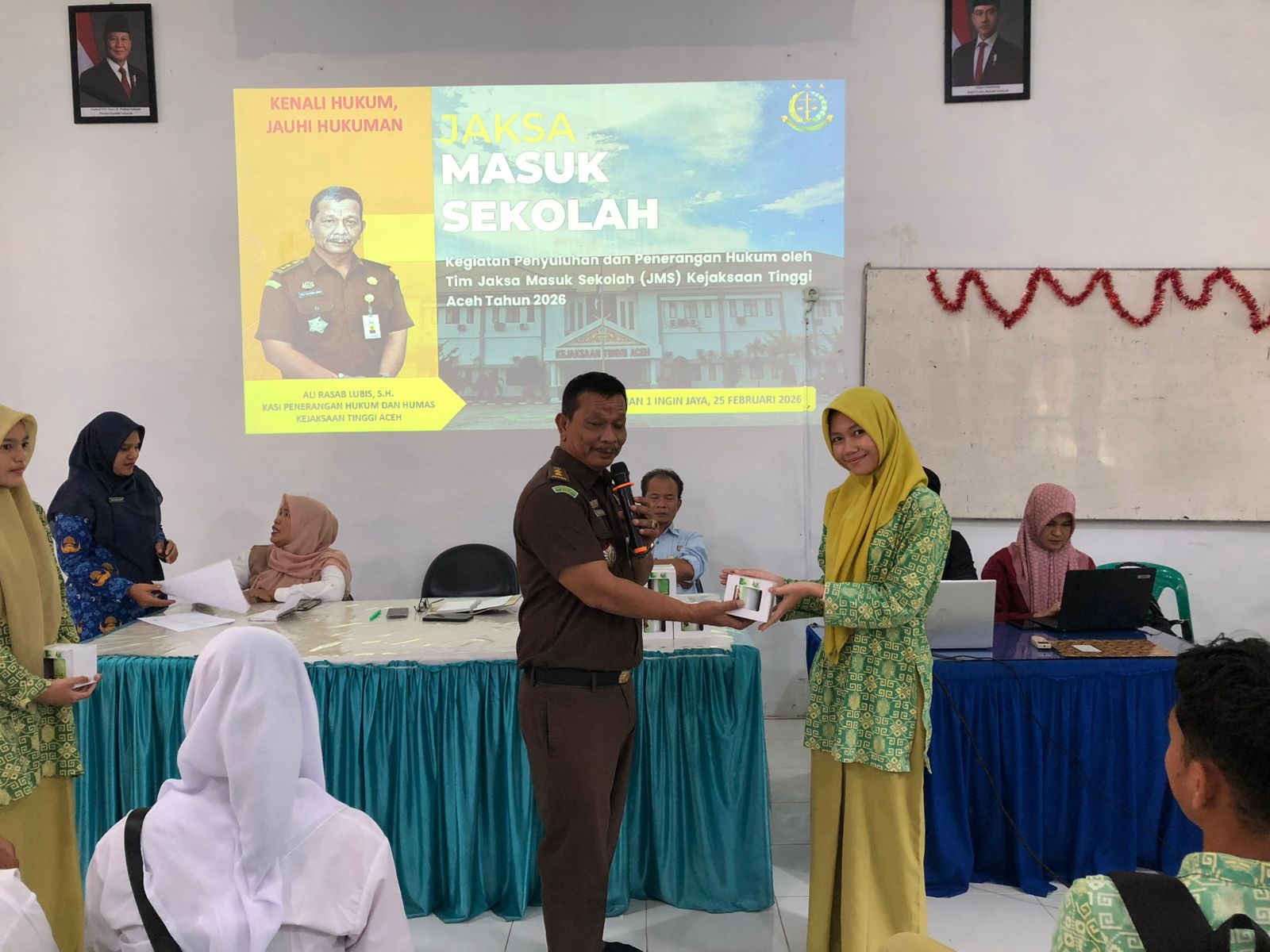 MediaNanggroe.com — Kejaksaan Tinggi Aceh melalui program Jaksa Masuk Sekolah (JMS) memberikan penyuluhan hukum kepada para siswa SMA Negeri 1 Ingin Jaya, Kabupaten Aceh Besar. Kegiatan yang berlangsung di aula sekolah tersebut digelar pada Kamis (26/2/2026) sebagai upaya meningkatkan kesadaran hukum pelajar sejak dini.