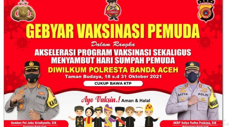 MediaNanggroe.com, Banda Aceh – Sambut hari Sumpah Pemuda ke 93, Polresta Banda Aceh menggelar vaksinasi pemuda yang dipusatkan di Taman Seni dan Budaya Aceh, Banda Aceh selama dua pekan.