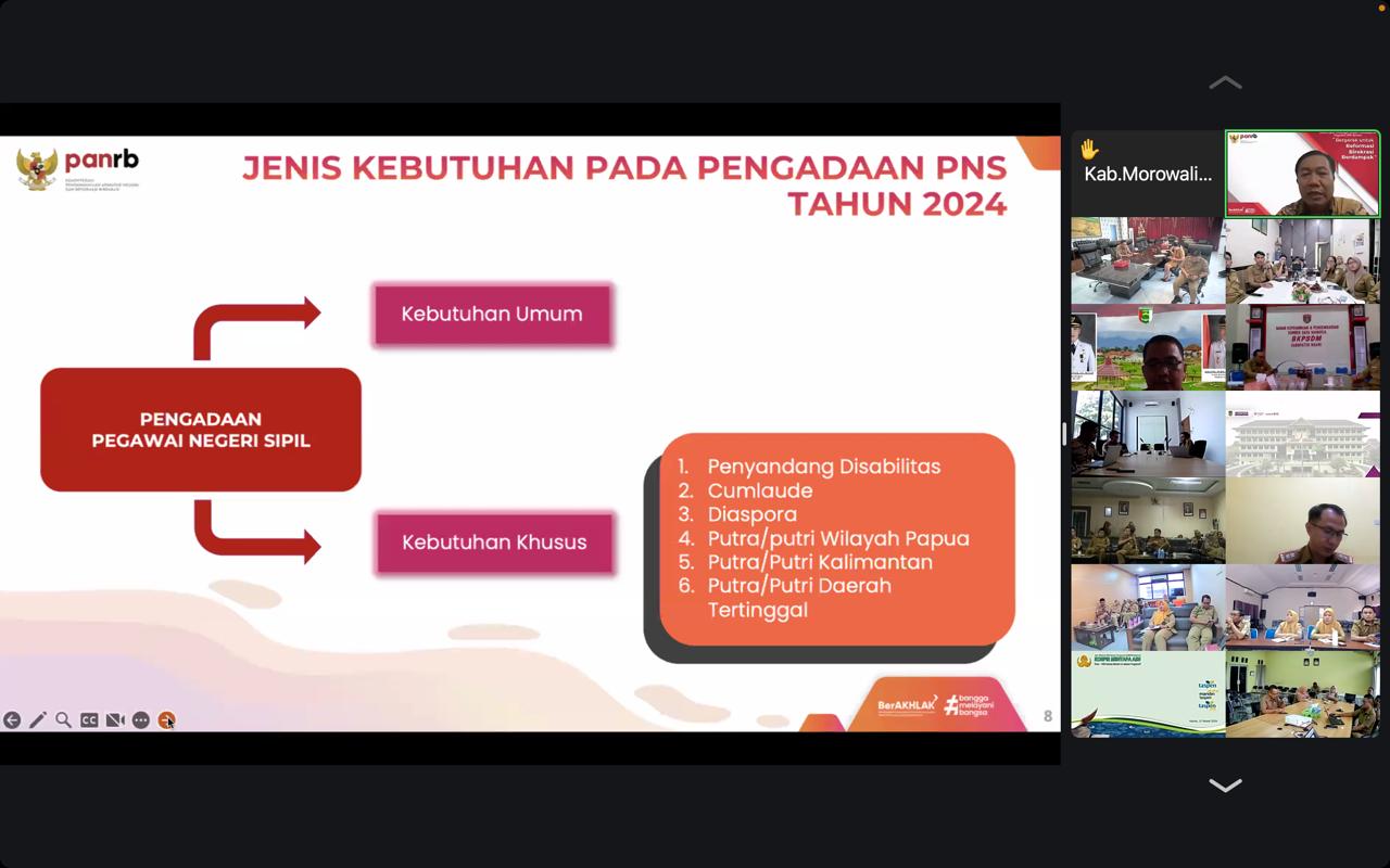 Aba menyampaikan jenis kebutuhan pada Pengadaan PNS Tahun 2024 terdiri dari Kebutuhan Umum dan kebutuhan khusus. “Kebutuhan Khusus diperuntukkan bagi penyandang disabilitas, cumlaude, diaspora, putra/putri Papua, putra/putri Kalimantan, serta putra/i daerah 3T (Terdepan, Terpencil dan Tertinggal),” jelasnya.