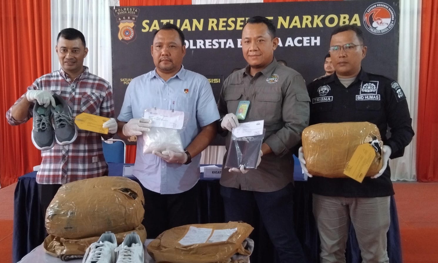 “Saat pemeriksaan petugas curiga dengan keduanya, sehingga digeledah dan ditemukan empat paket sabu dengan total berat satu kilogram di sepatu mereka,” ujar Kapolresta Banda Aceh, Kombes Pol Fahmi Irwan Ramli melalui Kasat Resnarkoba, AKP Rajabul Asra di Mapolresta Banda Aceh, Selasa (27/8/2024).